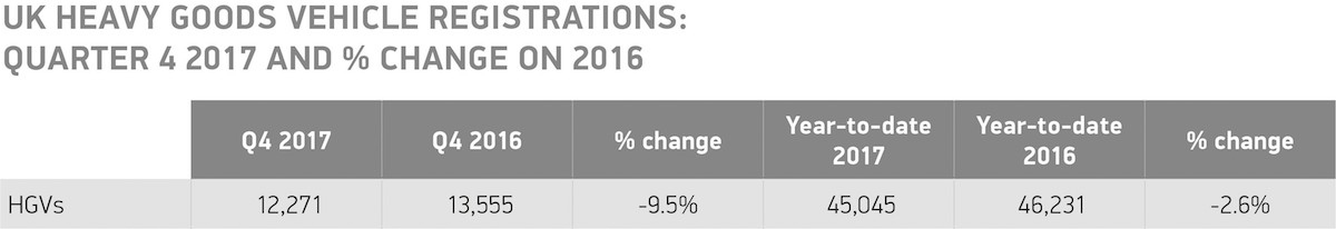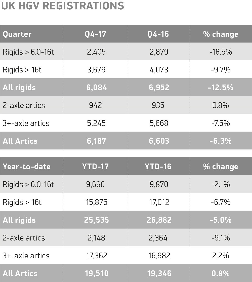 The full-year results were certainly dragged down by poor results across the board over the last three months of the year. Rigid registrations were down by 12.5% compared to Q4 2016, and articulated vehicles were down by more than 6%.